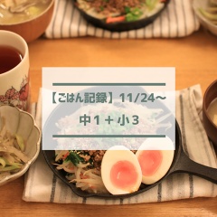 ニトスキでビビンバ【ごはん記録11/24~】 2025年12月06日 カテゴリ: ごはん記録(中1+小3) 無印の福缶、今回も落選したー旦那も落選…なかなか当たらなくなっちゃったのね…( ノД`)2025/11/24~のごはん記録。娘13歳(中1)・息子8歳(小3)・ごはん・厚揚げ入り野菜炒め・里芋とイカの煮物・ブロッコリー・味噌汁・ヨーグルト(りんごジャム)・みかん * * * * *