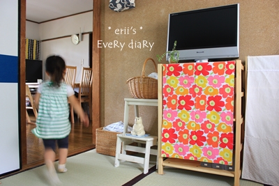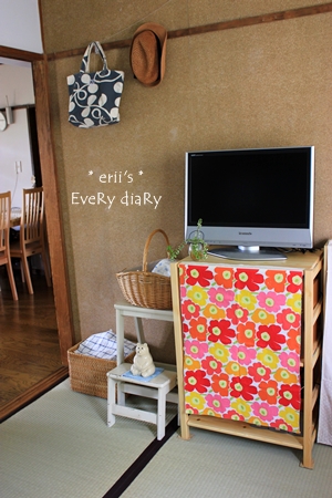 マリメッコの布で目隠し。しわしわ…