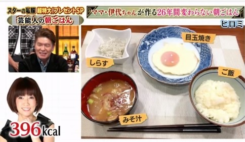 ヒロミは「朝ご飯、これだけなのよ。(この日は)しらすが入ってるけどね。そりゃ、うちの伊代ちゃんがやってますから。これ以外、出しようがないんだもん」と穏やかに笑いながら話した。