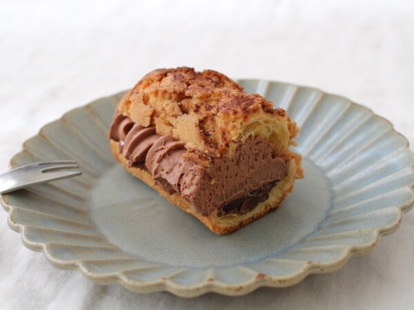 香ばしいクッキー生地を重ねた歯切れの良いエクレア皮に、パリパリショコラ、カカオ香るショコラカスタードクリーム、口どけの良いショコラホイップクリームを詰めました。