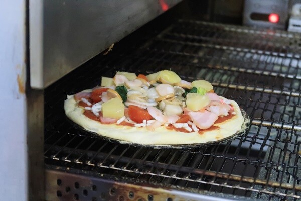 ↑ベルトコンベアのようなオーブンで焼き上げる。